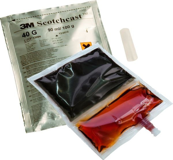 Zwei-Komponenten PU Kabelharz im transparenten Mischpackbeutel mit optimiertem GMG-System (Geschlossenes Mischen und Gießen), Hydrophob, kann im Wasser aushärten 3M™ Scotchcast™ Gießharz 40 ist ein zweikomponentiges Polyurethanharz für allgemeine Anwendungen, das bei Raumtemperatur aushärtet. Es wird in einem zweikomponentigen Kunststoffbeutel im richtigen stöchiometrischen Verhältnis durch Aufreißen einer Trennnaht geliefert. 3M™ Scotchcast™ Gießharz 40 eignet sich als elektrische Isolierung und mechanischem Schutz von elektrischen Verbindungen für den Einsatz bis 1 kV. Das wasserabweisende Polyurethanharz erfüllt die Anforderungen gemäß CENELEC HD631.1 S2 und ist mit der EU-Richtlinie 2011/65/EC (RoHS) sowie mit der EU-Richtlinie 1907/2006/EG (REACH) konform. Es gewährleistet den höchsten Grad an elektrischer Isolierung für die professionelle Anwendung. Schnelle und saubere Anwendung dank dem neuen 3M patentierten integriertem Vergussstutzen im Harzbeutel. Beutelöffner wird mitgeliefert.