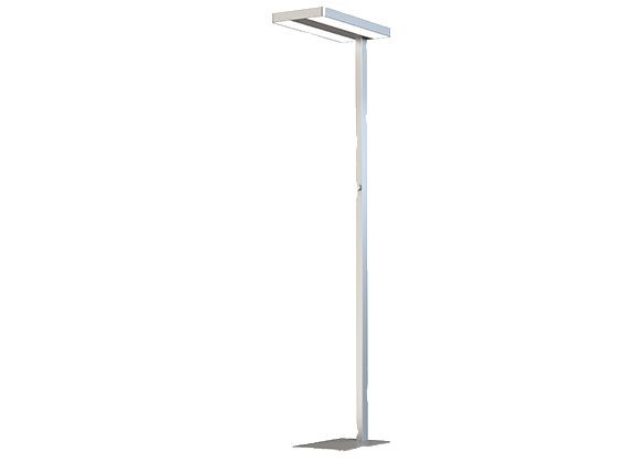 Stehleuchte, kann einfach mittels 4 Schrauben auf- und abgebaut werden, daher geringere Packmaße und Lagerfläche, bildschirmarbeitsplatztauglich und effizient mit UGR<18 und 90 lm/W, unten mikroprismatisch / oben opal, einstellbar über Dreh-Dimmer, sehr gutes Preis-/Leistungsverhältnis, 5 Jahre Garantie.