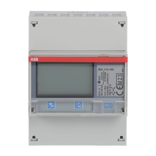 Drehstromzähler zur Messung eines Dreileiter- oder Vierleiter-Drehstromnetzes über einen Wandler-Anschluss CT (Wandlerverhältnis für Strom konfigurierbar) bis maximal 6 A. Folgende Werte werden über eine Siebensegmentanzeige mit bis zu 7 Stellen ausgegeben: Wirkenergie (Klasse 1), Leistungen, Ströme, Spannungen (L-L, L-N) und Frequenz sowohl je Phase als auch gesamt. Die Kommunikation kann über die integrierte Schnittstelle RS485 (Modbus RTU) oder über die Infrarotschnittstelle zur Anbindung eines KNX-Moduls erfolgen. Der Energiezähler hat einen Impulsausgang. Der Zähler ist geeicht nach MID und zugelassen gemäß IEC. Die Einbaubreite beträgt 4 DIN-Module.