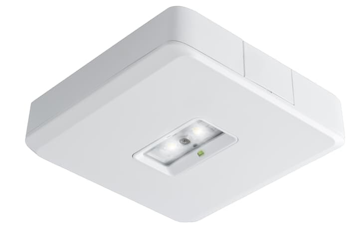 Dezente, kleine Sicherheitsleuchte in sehr flachem, weißen Gehäuse (RAL 9003), mit optimierter Ausleuchtung von Flächen zur Erreichung besonders weiter Montageabstände bei Deckenhöhen von 4,0 bis 12,0 m.