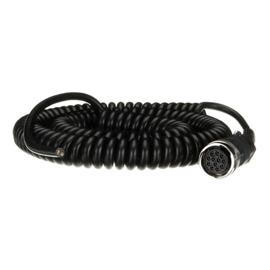 Spiralkabel mit gerader Cannon-Buchse und offenem Ende. 12x0,25 mm2. Schwarzes PUR. 3,2 Meter ausgezogen.
