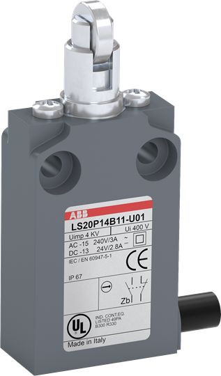 LS20P14B11-U01 ist ein 30 mm breiter, kompakter Positionsschalter aus glasfaserverstärktem UL-V0-Material, mit 2 Befestigungsbohrungen M4 oben, einem vorverdrahteten UL62 - PVC-Kabel (1 m) an der Seite, einem abgeflachten Stahl-Rollendruckbolzen sowie 1 Schließer + 1 Öffner als Sprungkontakt