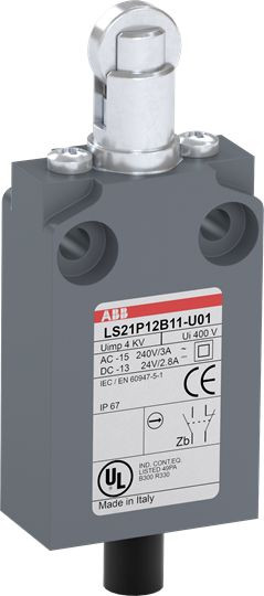 LS21P12B11-U01 ist ein 30 mm breiter, kompakter Positionsschalter aus glasfaserverstärktem UL-V0-Material, mit 2 Befestigungsbohrungen M4 oben, einem vorverdrahteten UL62 - PVC-Kabel (1 m) an der Seite, einem abgeflachten Stahl-Rollendruckbolzen sowie 1 Schließer + 1 Öffner als Sprungkontakt