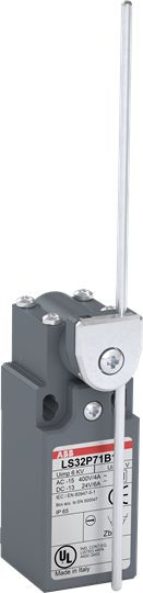 Der LS32P71B11 ist ein 30 mm breiter Positionsschalter aus glasfaserverstärktem UL-V0-Material, mit 2 Befestigungsbohrungen oben, 1 Kabeleinführung nach ISO M16x1,5 unten, einem abgeflachten, verstellbaren Edelstahl-Stabdrehhebel sowie 1 Schließer + 1 Öffner als Sprungkontakt