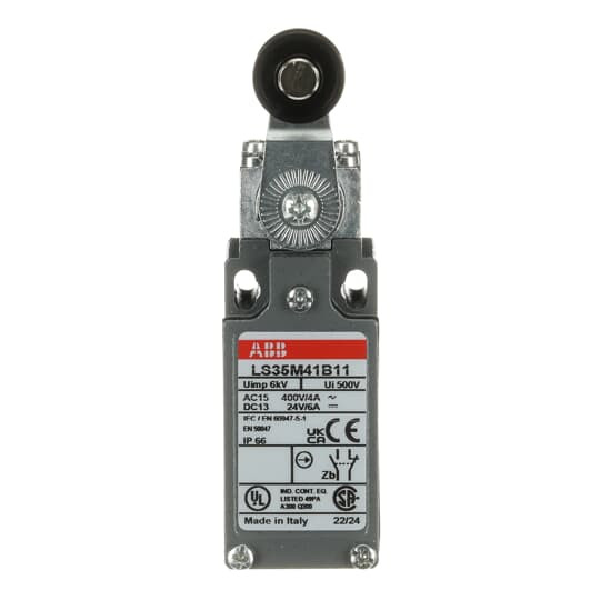 LS35M41B11 ist ein 30 mm breiter Positionsschalter aus einer Zinklegierung (Zamak), mit 2 Befestigungsbohrungen oben,1 1/2 Zoll NPT Kabeleinführung unten, 1 abgeflachten Kunststoff-Rollenschwenkhebel sowie 1 Schließer + 1 Öffner als Sprungkontakt