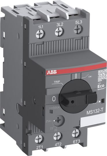 Transformatorschutzschalter MS132-T mit thermischem und elektromagnetischem Schutz steht für die kompakte und leistungsstarke Baureihe mit hohem Kurzschlussausschaltvermögen für den Transformatorschutz bis 25 A mit einer Modulbreite von 45 mm. Bei diesem Gerät wird der primärseitige Transformatornennstrom durch Einstellen an der Stromskala thermisch überwacht. Die Kurzschlussauslösung erfolgt bei Auftreten des 20-fachen Gerätenennstroms. Das temperaturkompensierte Gerät hat eine Drehgriffbedienung mit einer klaren Schaltstellungsanzeige I/TRIP/0. Darüber hinaus verfügt MS132-T über eine Kurzschlussanzeige. Der Drehgriff ist mit Hilfe eines Vorhängeschlosses in 0-Position direkt verriegelbar. Hilfs-, Signal- und Kurschlussmeldekontakte sowie Unterspannungs- und Arbeitsstromauslöser können ohne Werkzeug angebaut werden. 1-Phaseneinspeiseblöcke bis 25 mm² und Phasenverbinder unterstützen die Verdrahtung von 1-Phasentransformatoren.