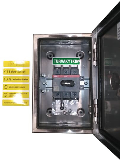| Kurzbeschreibung | Sicherheitsschalter im Edelstahlgehäuse 3-polig 30 kW 400 V mit schwarzem Griff |