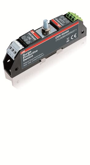 Kombinierte Überspannungs-Schutzeinrichtung für RS485 Schnittstelle, geprüft in den Kategorien D, C, B gemäß IEC/EN 61643 für blitzintensive Umgebungen, aufrastbar auf die 35mm Hutschiene, zur Verwendung an den Blitzschutzzonen LPZ 0 bis 3, Erdanschluss mit M6-Erdungsbolzen, kombinierbar mit der Erdungsschiene der Gehäuse OVR CME.