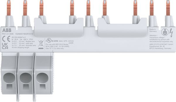 Die 3-phasige Stromschiene PS1-2-0-65K ermöglicht eine einfache und schnelle Paralleleinspeisung von 3x MS132-K Motorschutzschaltern + 1 seitlichem Hilfsschalter HK1 ohne Werkzeug durch einfaches Einstecken der Stromschiene in die Klemmen. Der Einspeiseblock ist in die Stromschiene integriert. Der Bemessungsbetriebsstrom beträgt 65 A. Die PS1-K-Sammelschienen sind für UL Type E und Type F Anwendungen zugelassen.