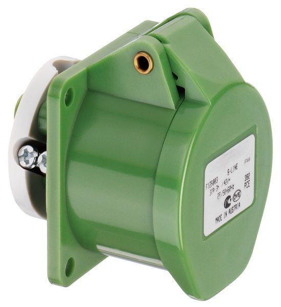 | Kurzbeschreibung | CEE Flanschsteckdose gerade, IP44, 16A, 2-polig, 24/42V, 4h, grün |