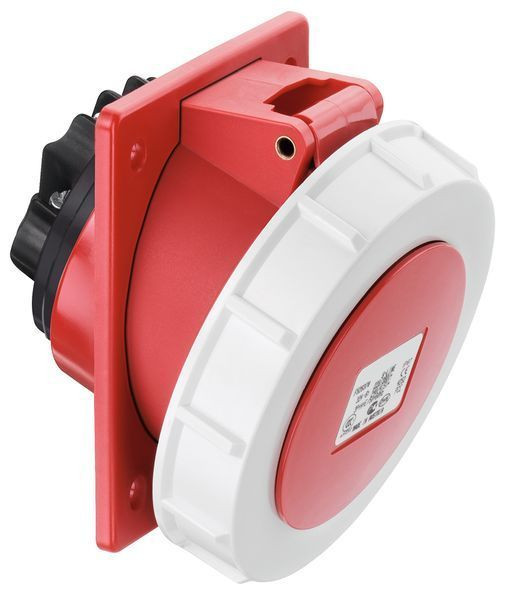 CEE Flanschsteckdose, schräg 20°, VDE 0623, EN 60309 Teil 1/2, IEC 60309, Befestigung 4 x von außen, Schutzart wasserdicht IP67, Nennstrom 16A, 4-polig, Nennspannung 110V AC, 4h, gelb, Schraubklemmen, dreiteilig, alle Flanschsteckdosen sindmit vernickelten Kontakten