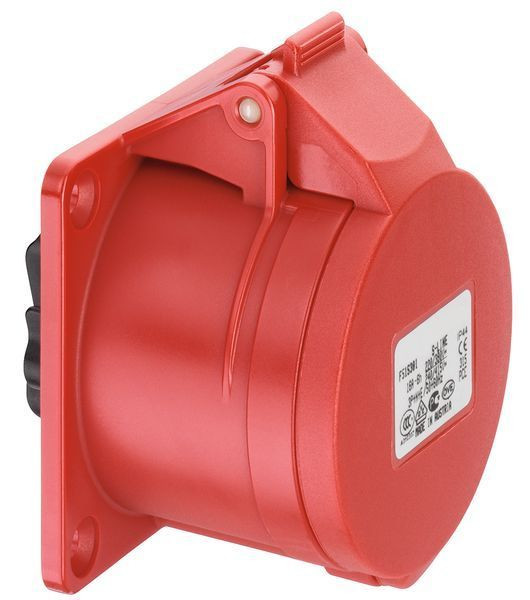 CEE Flanschsteckdose gerade, nach IEC 60309, EN 60309, VDE 0623, spritzwassergeschützt IP44, Nennstrom 16A, 5-polig, Nennspannung 400V AC, 6h rot, Schraubklemmen, alle Flanschsteckdosen sind mit unvernickelten Kontakten