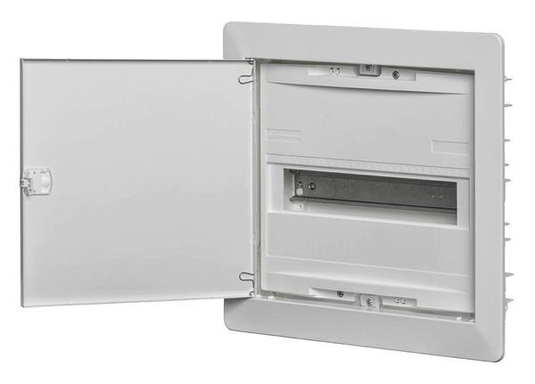 Hohlwand-Kleinverteiler mit Steckklemmen,N+PE je 3 x2,5-16 + 14 x1,5-4mm²,Blendrahmen BxHxT (mm) 344 x349 x11,Ausschnittmaße BxHxT (mm) 310 x295 x88,TE je 18mm 12/14,Reihen 1,Hohlwand-Kleinverteiler,Schutzisoliert II,Schutzart: IP 30,Für Geräte bis 63A,Farbton: RAL 9016,verkehrsweiß,Einfachster Türanschlagwechsel ohne Demontage des Blendrahmens,Flacher Türverschluss mit Schnapptechnik,EinfachesAustauschen gegen ein Schloss,Geeignet für Einbaugeräte bis 70mm Tiefe,Gebaut nach DIN VDE 0603-1,DIN 43871,MauerkastenAus Kunststoff,mit GerätetragschieneAus Stahlblech,Tiefe 88/90mm,N/PE-Steckklemmen,fingersicher in montagefreundlicher Schnapptechnik,N-FI-Erweiterungsklemme,serienmäßig für 2-,3- und 4-reihige Verteiler zur seitlichen Schnappbefestigung enthalten,Geräteabdeckung mit Geräteausschnitten,H = 46mm,für 12 TE,(symmetrisch erweiterbarAuf 14 TE),Plombierbar,2-Punkt-Befestigung,Blendrahmen mit VolltürAus Stahlblech,Stromkreisbeschriftungen und Blatt mit Piktogrammen,Putzschutzplatte,