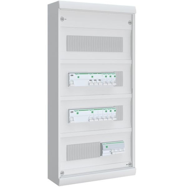 Kleinverteiler für Aufputzmontage bestehend aus: Gehäuse, 4-reihig, 48 TE, mit PE/N-Steckklemmen, mit FI-N-Erweiterungsklemme, vorverdrahtet und bestückt mit: 2x FI 40 A (3P+N), 9x LS Schalter 1-polig 16 A, 1x LS Schalter 3-polig 20 A, 1x Überspannungsableiter Typ 2, 1x Hauptleitungsabzweigklemme