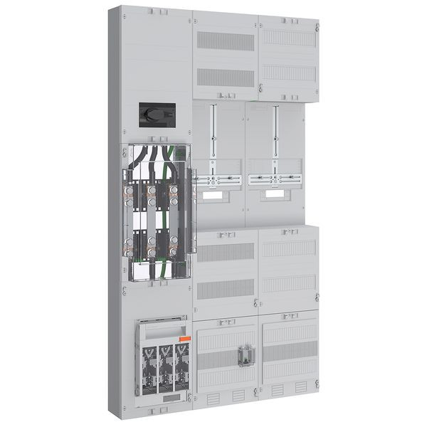 Zähler-Wandlerfeld 200 A nach TAB EWE Netz bestehend aus: 1x NAR mit 40 mm Sammelschiene 2x12x5 mm bestückt NH1 Trenner, 1x Wandlermodul 450 mm mit Wandlerlaschen Bauform A mit 30 x 5 mm, 1x AAR Lasttrennschalter 3-polig 250 A und Klemme für N und PE, 1x AAR 300 mm 24 TE, 1x APZ-Raum 300 mm mit RJ45 Schnittstelle, 1x 3-Punkt Zählerplatz 450 mm, 1x 3-Punkt FRE-Platz 450 mm, 1x Wandlerzusatzraum 300 mm 24 TE bestückt mit Spannungspfadsicherungen und Wandler-Trennklemmen, 1x NAR mit 40 mm Sammelschiene 2x12x5 mm mit 4x Sammelschienenklemme 120 mm² 1x Sammelschienenklemme 70 mm²