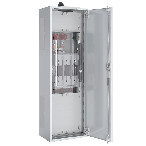 Anschlussschrank bestehend aus: 3x 1-polig NH2-Unterteil, 40 mm Sammelschienensystem 12 x 5 mm, 5-polig, mit Kabeleinführungsflansch 1x 14-54 mm, in Bauhöhe 6 und Baubreite 1