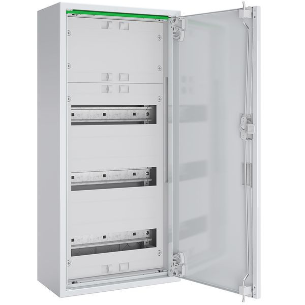 Komplettschrank für Aufputzmontage bestehend aus: RM-Gehäuse mit Volltür, 1x Verteilerfeld 3-reihig, 36 TE, für Reiheneinbaugeräte, mit geschlossenener Abdeckung und isolierten Gerätetragschienen für Reihenklemmen, IP44