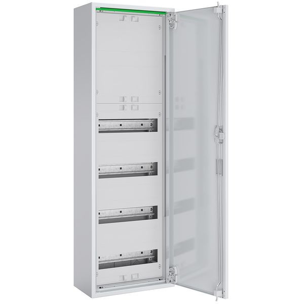 Komplettschrank für Aufputzmontage bestehend aus: RM-Gehäuse mit Volltür, 1x Verteilerfeld 4-reihig, 48 TE, für Reiheneinbaugeräte, mit geschlossenener Abdeckung und isolierten Gerätetragschienen für Reihenklemmen, IP44