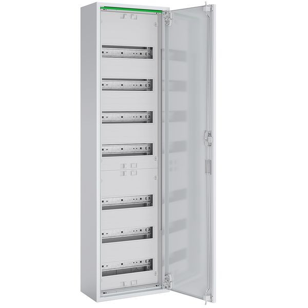 Komplettschrank für Aufputzmontage bestehend aus: RM-Gehäuse mit Volltür, 1x Verteilerfeld 7-reihig, 84 TE, für Reiheneinbaugeräte, mit PE/N-Steckklemmen, IP44