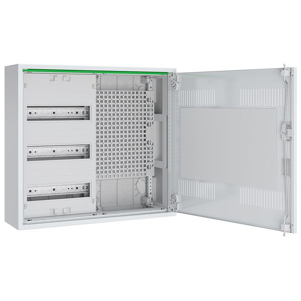 Komplettschrank für Aufputzmontage bestehend aus: RM-Gehäuse mit Mediatür, 1x Verteilerfeld 3-reihig, 1x Multimediafeld LexCom Home bestehend aus: 2x vollflächige Multimedia-Montagefläche zur Aufnahme von LexCom Zubehör in Steck- und Schraubtechnik, IP31