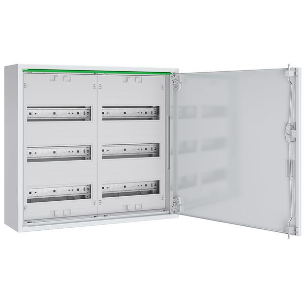 Komplettschrank für Aufputzmontage bestehend aus: RM-Gehäuse mit Volltür, 2x Verteilerfeld 3-reihig, 72 TE, für Reiheneinbaugeräte, mit PE/N-Steckklemmen, IP44