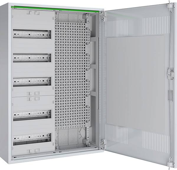 Komplettschrank für Aufputzmontage bestehend aus: RM-Gehäuse mit Mediatür, 1x Verteilerfeld 4-reihig, 1x Multimediafeld LexCom Home bestehend aus: 3x vollflächige Multimedia-Montagefläche zur Aufnahme von LexCom Zubehör in Steck- und Schraubtechnik, IP31
