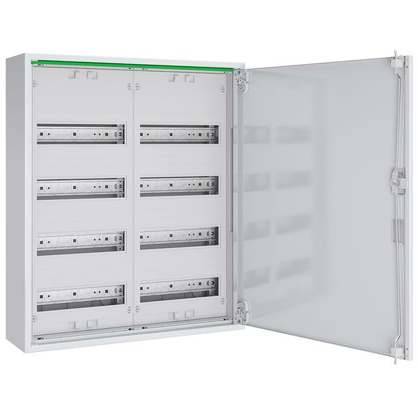 Komplettschrank für Aufputzmontage bestehend aus: RM-Gehäuse mit Volltür, 2x Verteilerfeld 4-reihig, 96 TE, für Reiheneinbaugeräte, mit PE/N-Steckklemmen, IP44