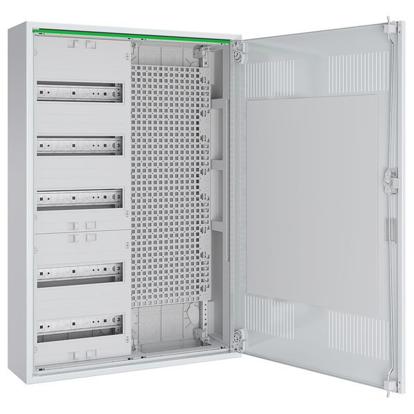 Komplettschrank für Aufputzmontage bestehend aus: RM-Gehäuse mit Mediatür, 1x Verteilerfeld 5-reihig, 1x Multimediafeld LexCom Home bestehend aus: 4x vollflächige Multimedia-Montagefläche zur Aufnahme von LexCom Zubehör in Steck- und Schraubtechnik, IP31