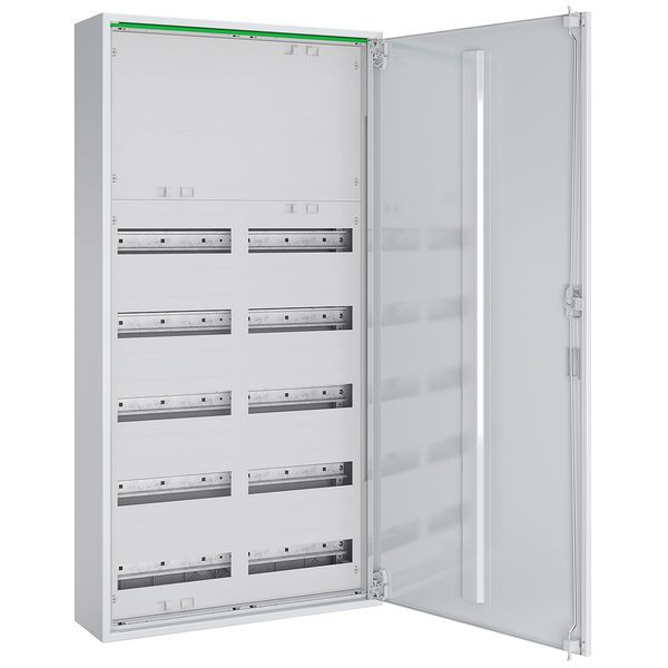 Komplettschrank für Aufputzmontage bestehend aus: RM-Gehäuse mit Volltür, 2x Verteilerfeld 5-reihig, 120 TE, für Reiheneinbaugeräte, mit geschlossenener Abdeckung und isolierten Gerätetragschienen für Reihenklemmen, IP44