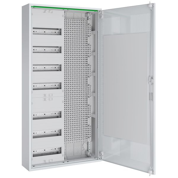 Komplettschrank für Aufputzmontage bestehend aus: RM-Gehäuse mit Mediatür, 1x Verteilerfeld 7-reihig, 1x Multimediafeld LexCom Home bestehend aus: 6x vollflächige Multimedia-Montagefläche zur Aufnahme von LexCom Zubehör in Steck- und Schraubtechnik, IP31
