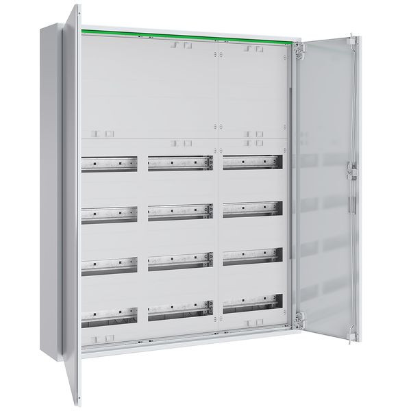 Komplettschrank für Aufputzmontage bestehend aus: RM-Gehäuse mit Volltür, 3x Verteilerfeld 4-reihig, 144 TE, für Reiheneinbaugeräte, mit geschlossenener Abdeckung und isolierten Gerätetragschienen für Reihenklemmen, IP44