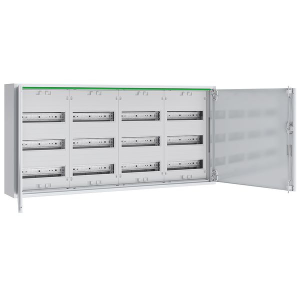 Komplettschrank für Aufputzmontage bestehend aus: RM-Gehäuse mit Volltür, 4x Verteilerfeld 3-reihig, 144 TE, für Reiheneinbaugeräte, mit PE/N-Steckklemmen, IP44