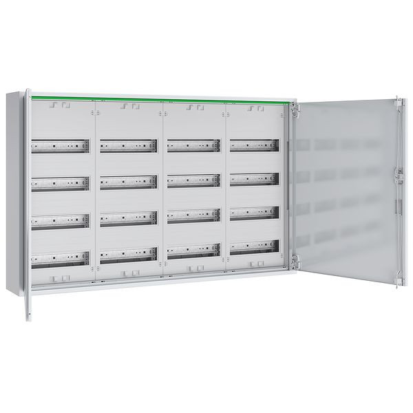 Komplettschrank für Aufputzmontage bestehend aus: RM-Gehäuse mit Volltür, 4x Verteilerfeld 4-reihig, 192 TE, für Reiheneinbaugeräte, mit PE/N-Steckklemmen, IP44