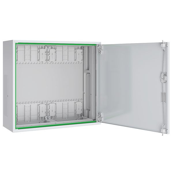 Systemgehäuse für AP-, UP- und teilversenkter Montage, bestehend aus: Leergehäuse mit flächenbündiger Leitungsmembran, seitlichen Vorprägungen für Querverdrahtung im AAR und Sammelschienenverbindung im NAR, Volltür, Abmessungen: 550x500x210 mm, Schutzklasse II (schutzisoliert), Schutzart IP43, Stahlblech pulverbeschichtet, 72 Teilungseinheiten,