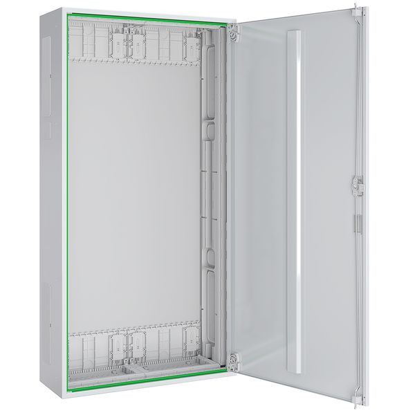 Systemgehäuse für AP-, UP- und teilversenkter Montage, bestehend aus: Leergehäuse mit flächenbündiger Leitungsmembran, seitlichen Vorprägungen für Querverdrahtung im AAR und Sammelschienenverbindung im NAR, Volltür, Abmessungen: 550x1100x210 mm, Schutzklasse II (schutzisoliert), Schutzart IP54, Stahlblech pulverbeschichtet, 168 Teilungseinheiten,