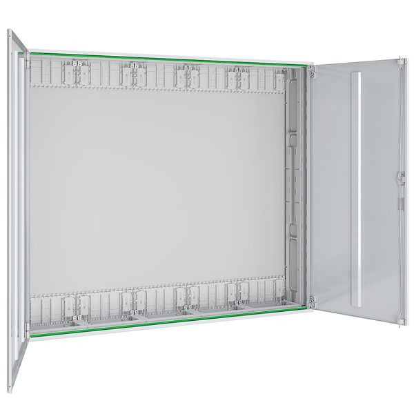 Systemgehäuse für AP-, UP- und teilversenkter Montage, bestehend aus: Leergehäuse mit flächenbündiger Leitungsmembran, seitlichen Vorprägungen für Querverdrahtung im AAR und Sammelschienenverbindung im NAR, Volltür mit Schubstangen, Abmessungen: 1300x1100x210 mm, Schutzklasse II (schutzisoliert), Schutzart IP54, Stahlblech pulverbeschichtet, 420 Teilungseinheiten,