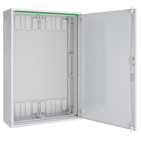 Systemgehäuse für AP-, UP- und teilversenkter Montage, bestehend aus: Leergehäuse mit flächenbündiger Leitungsmembran, seitlichen Vorprägungen für Querverdrahtung im AAR und Sammelschienenverbindung im NAR, Volltür, Abmessungen: 550x800x210 mm, Schutzklasse II (schutzisoliert), Schutzart IP44, Stahlblech pulverbeschichtet, 120 Teilungseinheiten