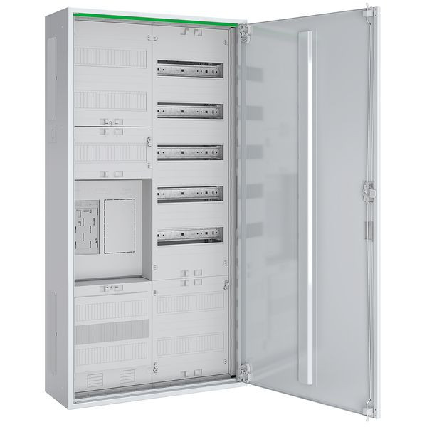 Komplettschrank bestehend aus: 1x eHZ-Kassette verdrahtet mit 5-poliger Hauptleitungsabzweigklemme, Sammelschienensystem 5-polig, 5x Anschlussklemmen 16 mm², 1x Zählerreserveplatz, 1x Verteilerfeld 5-reihig mit APZ-Raum inkl. RJ45-Schnittstelle