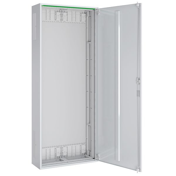 Systemgehäuse für AP-, UP- und teilversenkter Montage, bestehend aus: Leergehäuse mit flächenbündiger Leitungsmembran, seitlichen Vorprägungen für Querverdrahtung im AAR und Sammelschienenverbindung im NAR, Volltür, Abmessungen: 550x1400x210 mm, Schutzklasse II (schutzisoliert), Schutzart IP44, Stahlblech pulverbeschichtet, 216 Teilungseinheiten