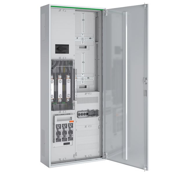 Wandlermess-Schrank 200 A nach TAB SH-Netz bestehend aus: Zähleschrank Schutzisoliert IP44, 1x NAR mit NH1 Lasttrennschalter und N/PE Anschluss, 1x Wandlermodul 450 mm für Wandlerlaschen Bauform A mit 30 mm Breite, 1x AAR mit Lasttrennschalter 3-polig 250 A und Klemme für N und PE, 1x Wandlerzusatzraum 300 mm 24 TE bestückt mit Spannungspfadsicherungen und Wandler-Trennklemmen, 1x 3-Punkt Zählerplatz 375 mm, 1x FRE-Platz 375 mm 3-Punkt, 1x APZ-Raum 300 mm mit RJ45 Schnittstelle