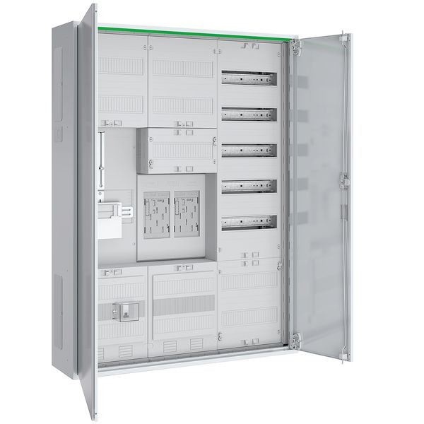 Komplettschrank bestehend aus: 2x eHZ-Kassette verdrahtet mit 5-poliger Hauptleitungsabzweigklemme, Sammelschienensystem 5-polig, 5x Anschlussklemmen 16 mm², kein Zählerreserveplatz, 1x Verteilerfeld 5-reihig mit APZ-Raum inkl. RJ45-Schnittstelle, 1x TSG-Platz mit Steuersicherung, 3-Punkt-Befestigung