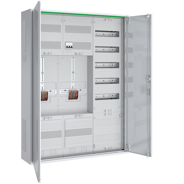 Komplettschrank bestehend aus: 2x 3-Punkt-Zählerplatz verdrahtet mit Hauptschalter, Sammelschienensystem 5-polig, 5x Anschlussklemmen 16 mm², kein Zählerreserveplatz, 1x Verteilerfeld 5-reihig mit APZ-Raum inkl. RJ45-Schnittstelle