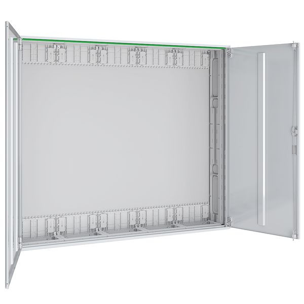 Systemgehäuse für AP-, UP- und teilversenkter Montage, bestehend aus: Leergehäuse mit flächenbündiger Leitungsmembran, seitlichen Vorprägungen für Querverdrahtung im AAR und Sammelschienenverbindung im NAR, Volltür mit Schubstangen, Abmessungen: 1300x1100x210 mm, Schutzklasse II (schutzisoliert), Schutzart IP44, Stahlblech pulverbeschichtet, 420 Teilungseinheiten