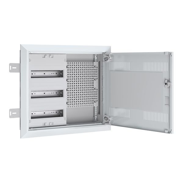 Komplettschrank für Unterputz- und Hohlwand- Montage bestehend aus: Blendrahmen inkl. Mediatür (Tür mit Lüftungsschlitzen und Kunststoffeinsatz für WLAN), 1x Verteilerfeld 3-reihig, 1x Multimediafeld LexCom Home bestehend aus: 2x vollflächige Multimedia-Montagefläche zur Aufnahme von LexCom Zubehör in Steck- und Schraubtechnik, IP30