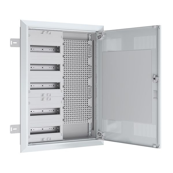 Komplettschrank für Unterputz- und Hohlwand- Montage bestehend aus: Blendrahmen inkl. Mediatür (Tür mit Lüftungsschlitzen und Kunststoffeinsatz für WLAN), 1x Verteilerfeld 5-reihig, 1x Multimediafeld LexCom Home bestehend aus: 4x vollflächige Multimedia-Montagefläche zur Aufnahme von LexCom Zubehör in Steck- und Schraubtechnik, IP30