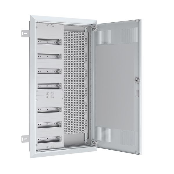 Komplettschrank für Unterputz- und Hohlwand- Montage bestehend aus: Blendrahmen inkl. Mediatür (Tür mit Lüftungsschlitzen und Kunststoffeinsatz für WLAN), 1x Verteilerfeld 7-reihig, 1x Multimediafeld LexCom Home bestehend aus: 6x vollflächige Multimedia-Montagefläche zur Aufnahme von LexCom Zubehör in Steck- und Schraubtechnik, IP30