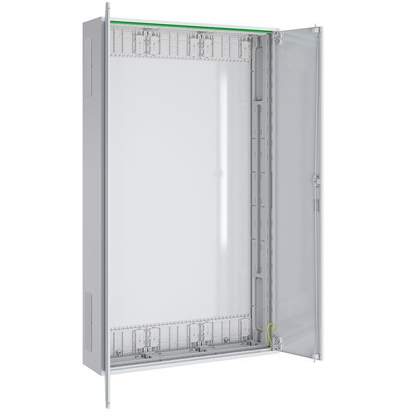 Systemgehäuse geerdet für AP-, UP- und teilversenkter Montage, bestehend aus: Leergehäuse mit flächenbündiger Leitungsmembran, seitlichen Vorprägungen für Querverdrahtung im AAR und Sammelschienenverbindung im NAR, Volltür mit Schubstangen, Abmessungen: 800x1400x210 mm, Schutzklasse II (schutzisoliert), Schutzart IP44, Stahlblech pulverbeschichtet, 324 Teilungseinheiten