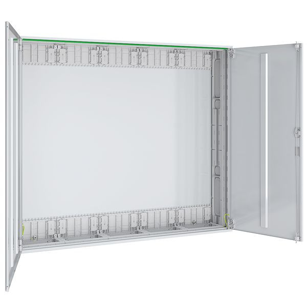 Systemgehäuse geerdet für AP-, UP- und teilversenkter Montage, bestehend aus: Leergehäuse mit flächenbündiger Leitungsmembran, seitlichen Vorprägungen für Querverdrahtung im AAR und Sammelschienenverbindung im NAR, Volltür mit Schubstangen, Abmessungen: 1300x1100x210 mm, Schutzklasse II (schutzisoliert), Schutzart IP44, Stahlblech pulverbeschichtet, 420 Teilungseinheiten