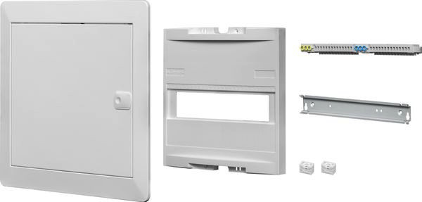 Einbausets mit Steckklemmen,N+PE je 3 x2,5-16 + 14 x1,5-4mm²,TE je 18mm 12,Reihen 1,Einbausets,Schutzisoliert II,Schutzart: IP30,Für Geräte bis 63A,Einfachster Türanschlagwechsel ohne Demontage des Blendrahmens,Flacher Türverschluss mit Schnapptechnik,EinfachesAustauschen gegen ein Schloss,Geeignet für Einbaugeräte bis 70mm Tiefe,Farbton: RAL 9016 (verkehrsweiß),Gebaut nach DIN VDE 0603-1,DIN 43871,Mauerkasten:,MauerkastenAus Kunststoff,Befestigungshaken (HW),Nagellaschen (UP),Putzschutzplatte,Einbauset:,Traggerüst mit Gerätetragschiene,Geräteabdeckung,Blendrahmen mit Volltür und Putzausgleich,N/PE-Steckklemmen,N-FI-Erweiterungsklemme (in 2-,3- und 4-reihigen Verteiler),Stromkreisbeschriftungen und Blatt mit Piktogrammen,