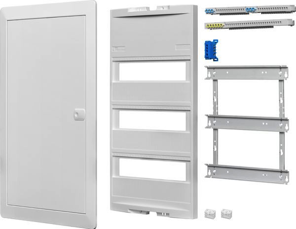 Einbausets mit Steckklemmen,PE 6 x2,5-16 + 21 x1,5-4mm²,N+N 2 x(3 x2,5-16 + 14 x1,4-4mm²),zusätzliche N-FI-Klemme 3 x16,2 x10mm²,TE je 18mm 36,Reihen 3,Einbausets,Schutzisoliert II,Schutzart: IP30,Für Geräte bis 63A,Einfachster Türanschlagwechsel ohne Demontage des Blendrahmens,Flacher Türverschluss mit Schnapptechnik,EinfachesAustauschen gegen ein Schloss,Geeignet für Einbaugeräte bis 70mm Tiefe,Farbton: RAL 9016 (verkehrsweiß),Gebaut nach DIN VDE 0603-1,DIN 43871,Mauerkasten:,MauerkastenAus Kunststoff,Befestigungshaken (HW),Nagellaschen (UP),Putzschutzplatte,Einbauset:,Traggerüst mit Gerätetragschiene,Geräteabdeckung,Blendrahmen mit Volltür und Putzausgleich,N/PE-Steckklemmen,N-FI-Erweiterungsklemme (in 2-,3- und 4-reihigen Verteiler),Stromkreisbeschriftungen und Blatt mit Piktogrammen,